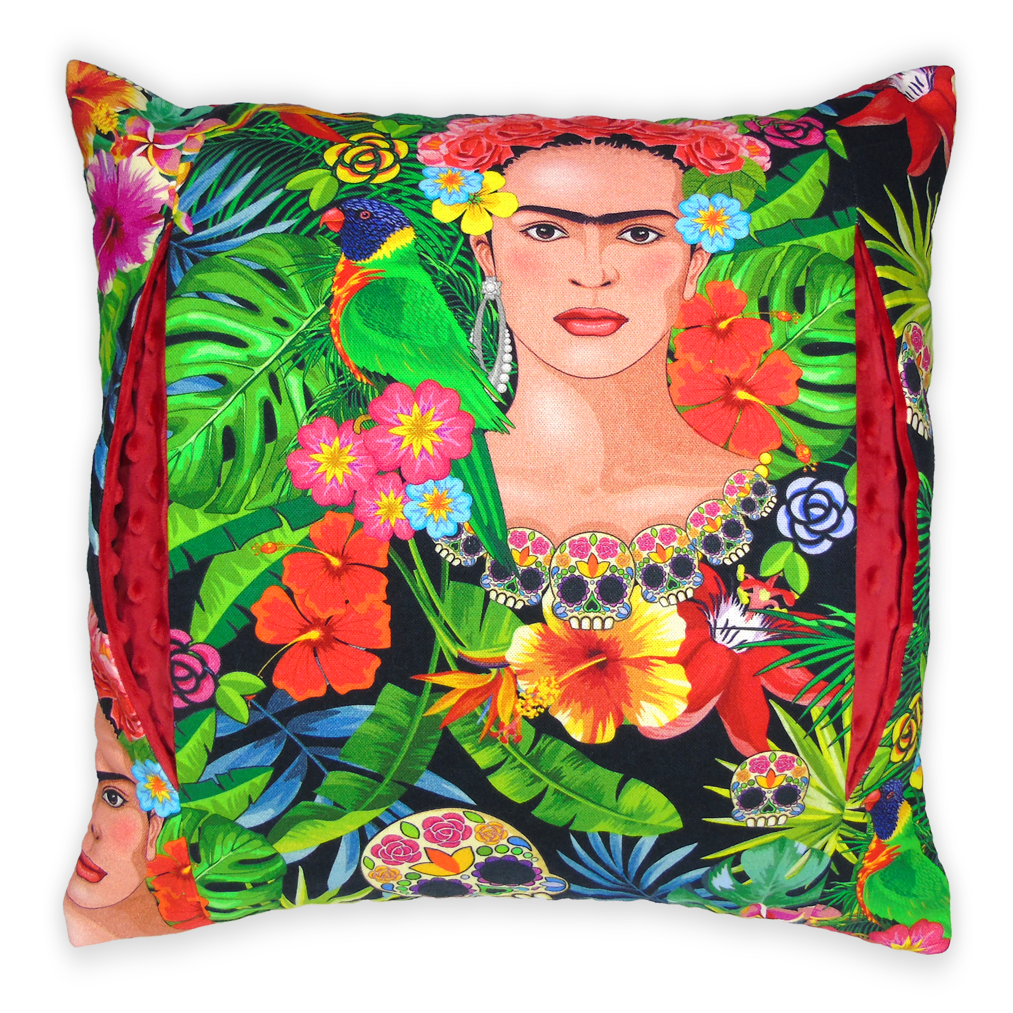 Almofada com duas aberturas laterais que recebem e acolhem calorosamente o abraço, vitaminado pela cor e com significado pelo padrão figurativo que escolher.